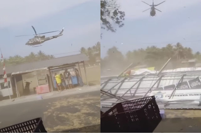 Tiupan angin kencang daripada kipas helikopter menyebabkan gerai milik penduduk rosak teruk, malah kain kanopi yang menutupi kedai diterbangkan angin ketika kejadian.